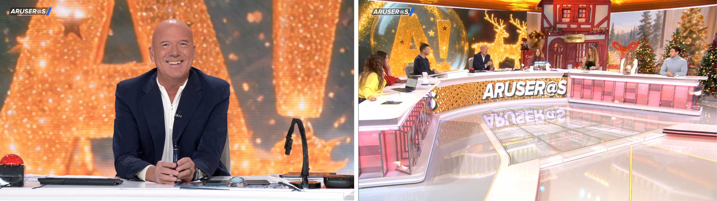 Con la llegada del otoño y la Navidad, se diseña y actualiza el sistema de grafismos, pantallas y cortinillas de temporada de Aruser@s, programa de televisión diario en directo de laSexta, jugando con su imagotipo A! como eje visual y adaptando la identidad del programa al ritmo y lenguaje del plató.